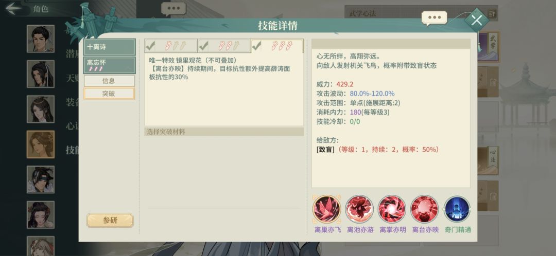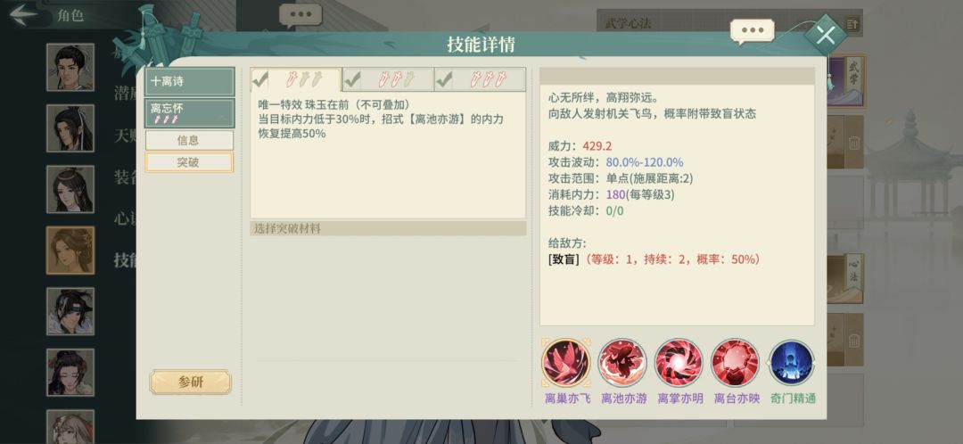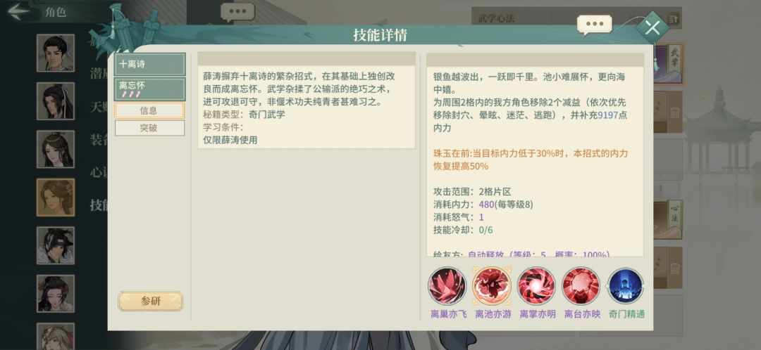 增益移除或自然消失时回复内力,此特效触发门槛极低,加上薛涛能够给全队提供大量乱七八糟的buff,可以很好地保证整体阵容的内力余量,避免被公孙绛、通玄、太极拳这类抽蓝侠客抽干内力。