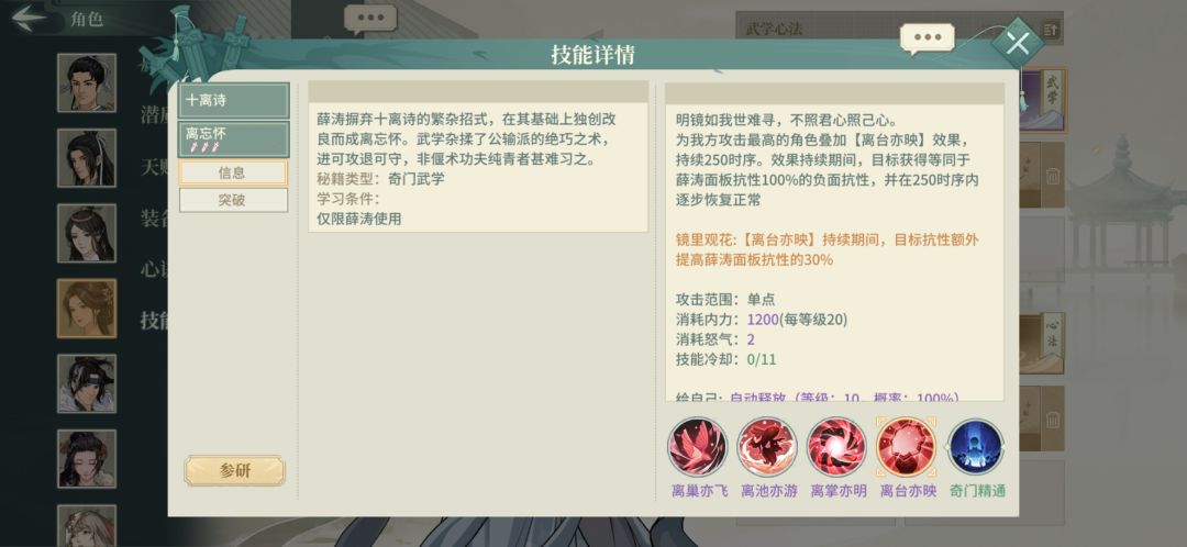 薛涛的最核心技能,给刀魔主增加250时序衰减大量抗性(每50时序效果衰减20%),让主角免疫掉绝大部分控制。免控对于刀魔主的意义极其重大,故之前刀魔的阵容一直绑定王维。薛涛是第二个能够给刀魔主《明显的》抵抗控制能力的侠客。注:此技能提供的抗性只与面板抗性有关,所以薛涛不适合无双心决和泰山剑法一类的配置。