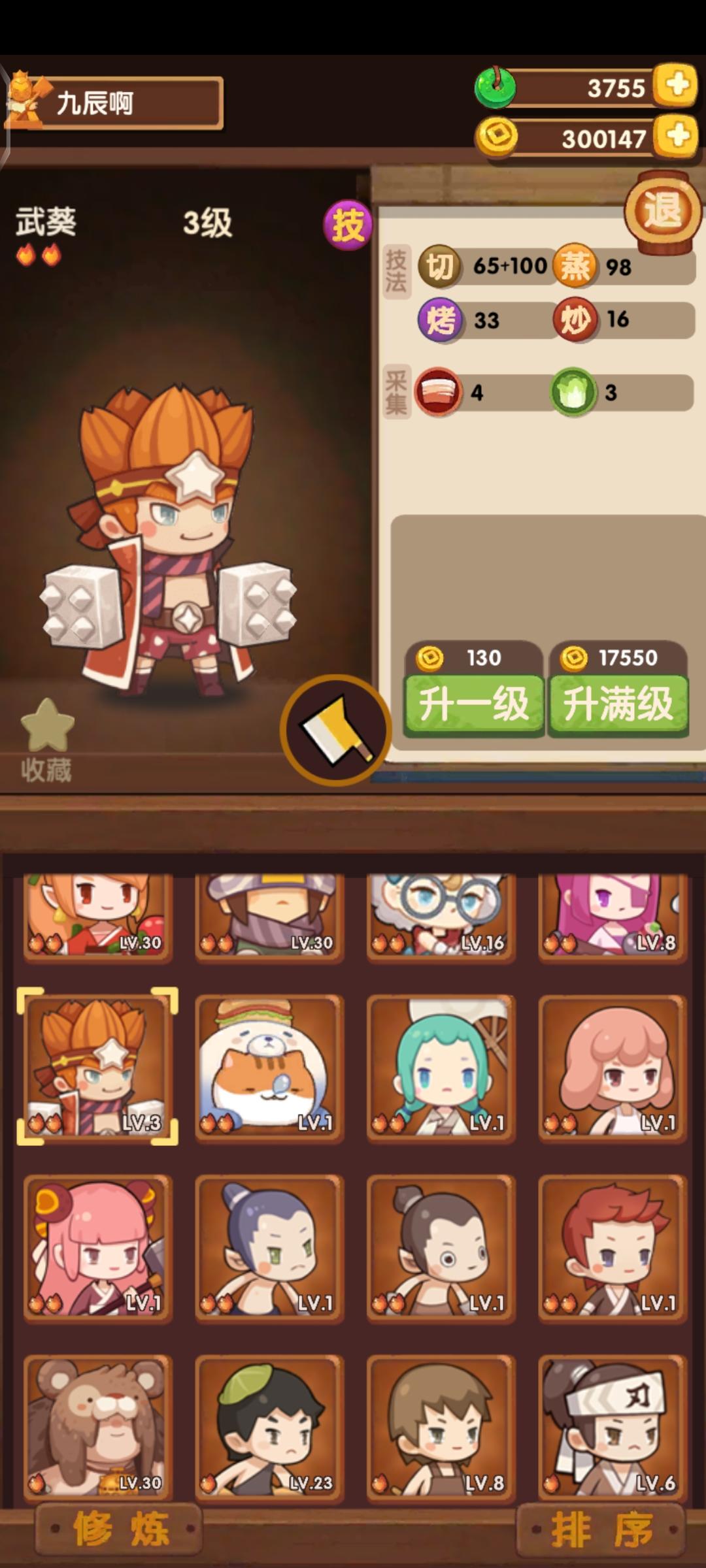 这些厨子是我目前升的最高的厨师,其他的距离满级都太多了,
