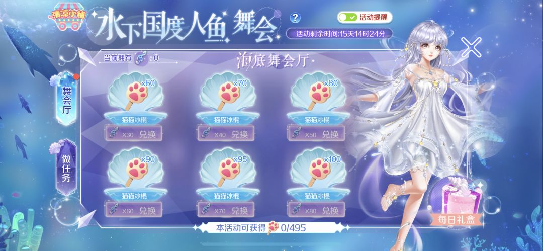 截止至8月21日,参与【水下国度 人鱼舞会】活动,完成任务获得海神的歌声,收到海神祝福的人就可以获得猫猫冰棍哦!