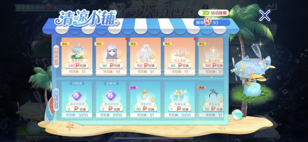清凉小铺持续营业中!免费臻品双人座椅-遨游天际,轻奢对戒-双鱼灯会,手持-66游泳圈,背饰-夏日冲浪,极光抽奖券*50通通都已经开启免费兑换啦,快去攒猫猫冰棍叭~