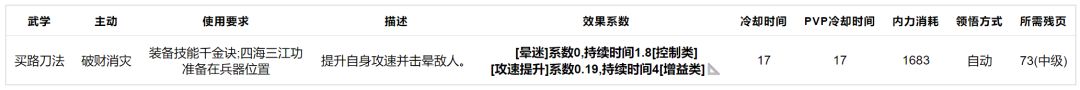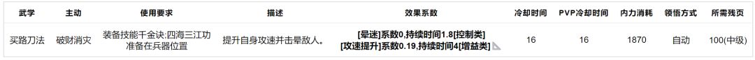买路刀法:平砍不行,技能附带控制与加速,中级武学。