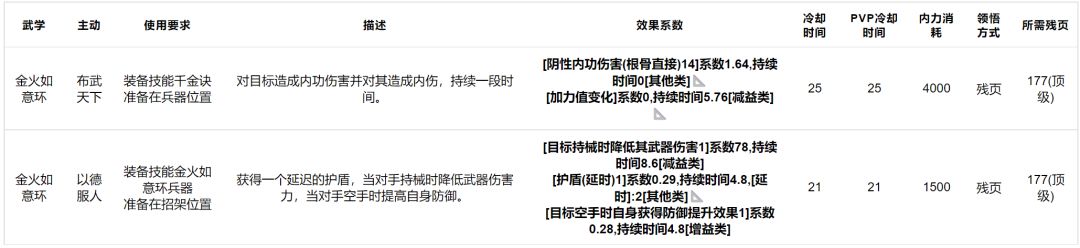 金火如意环:平砍一般,兵器招架位双技能,有护盾等效果,但作为招架时系数略有降低,未必能派上用场,顶级绝学。