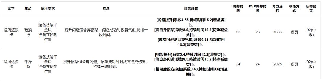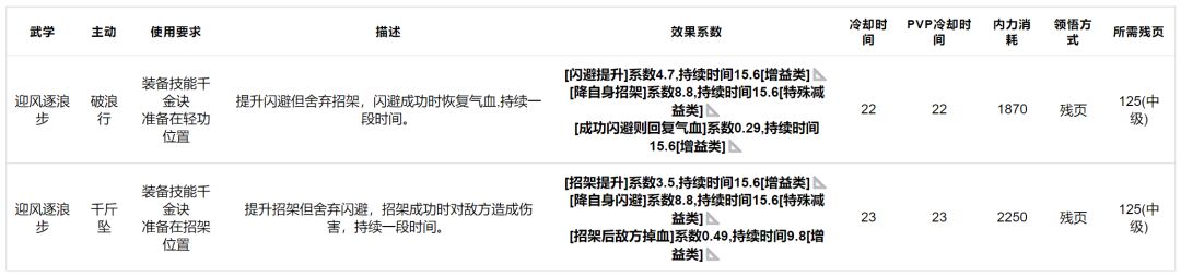 迎风逐浪步:双技能武学,轻功位与招架位都有技能,双技能续航能力都很强大,但与千金诀一样极度惧怕截脉技能,中级武学。