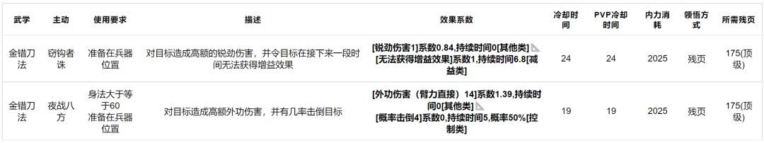 金错刀法:平砍不行,兵器位双技能,有真伤与控制,偏科比较严重吧,技能挺强但平砍弱导致基本没法上场,顶级绝学。