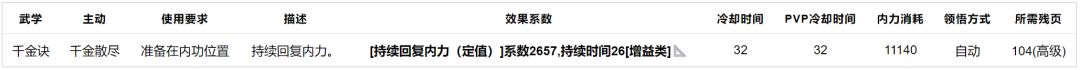 千金诀:续航内功,续航能力极强,但极度惧怕截脉技能,高级武学。