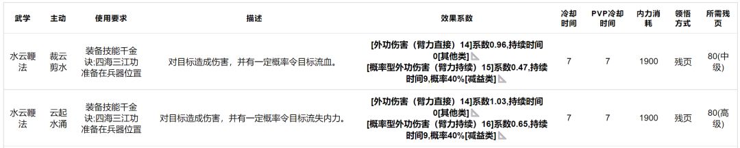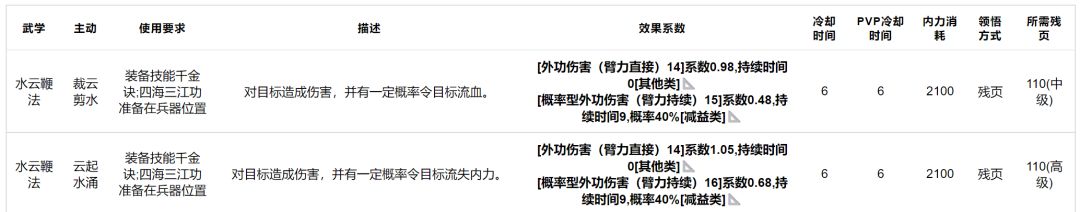 水云鞭法:平砍不错,兵器位双技能,都偏向赌概率,不算很强,中→高级武学。