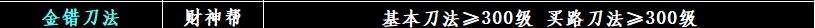 【金火如意环】: 技能【买路刀法】≥400级、技能【千金诀】≥450级
