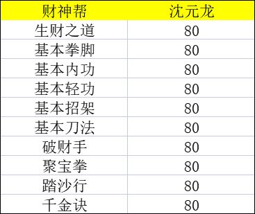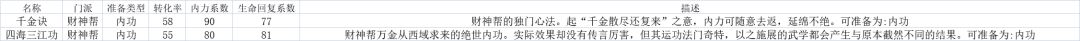 千金诀:超级强力的续航内功,但对于截脉的惧怕是非常大的,一旦被截脉,损失的内力就是财神帮的巨大亏损,且财神帮没有什么办法能防止截脉,持续时间极长的续航反而成为弊端,技能重数提升优先级为财神帮最高。