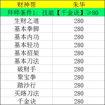 【四海三江功】: 技能【基本内功】≥350级、技能【生财之道】≥350级、技能【基本轻功】≥350级、技能【基本招架】≥350级