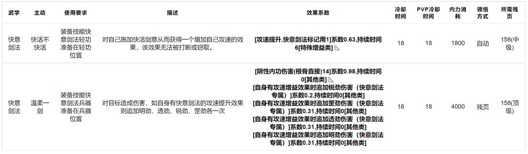输出:武学数量一般,数量质量上没有明显偏向,系数上只有快意剑法在同类武学中比较突出。