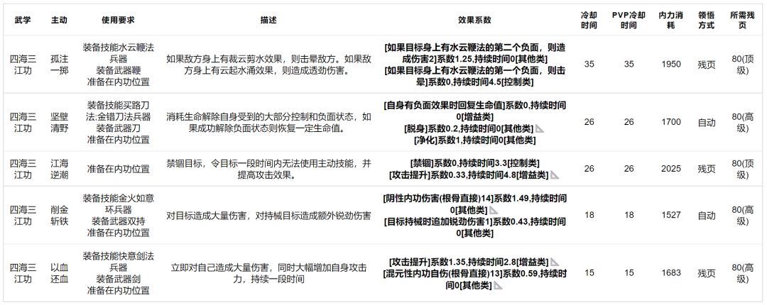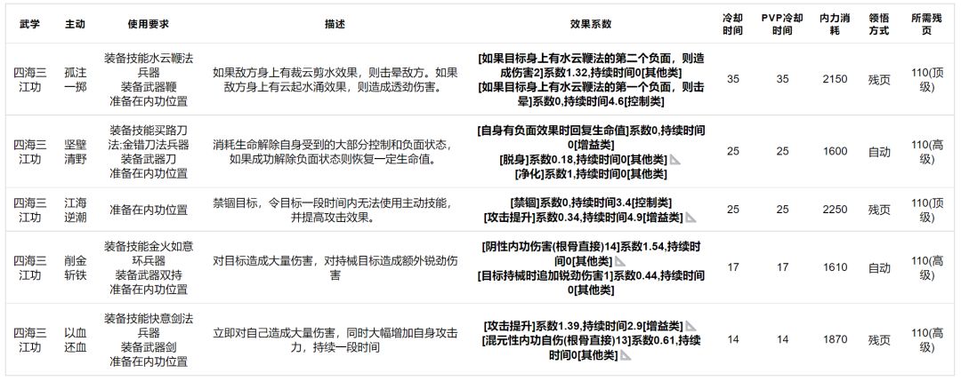 四海三江功:拥有五个技能的内功,但除了江海逆潮是只要装在内功位都有的技能外,其他四个技能均需要不同的使用要求,可以说变化是十分多样的,但技能强度有限,高→顶级绝学。