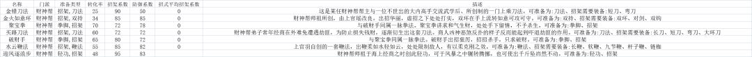 综上:仅看系数会认为财神帮是一个剑法类的门派,但从下文了解技能后可以得知,财神帮其实是十分依靠续航的门派,而拳脚战中这类技能的发挥是最好的,但缺点也十分明显,会在下文着重说明,所以财神帮大概属于优缺点十分明显被迫使用拳脚的续航门派,对此感兴趣的玩家可以优先考虑财神帮。