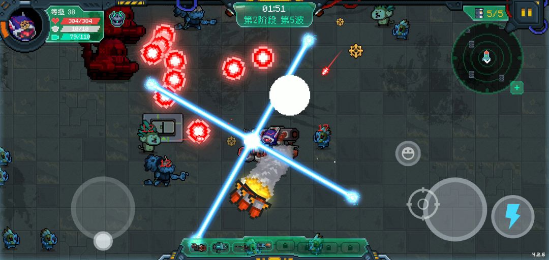 开局可以先不捡东西,先把火箭炮升3级,一下打两发的状态。然后慢慢捡其他东西。