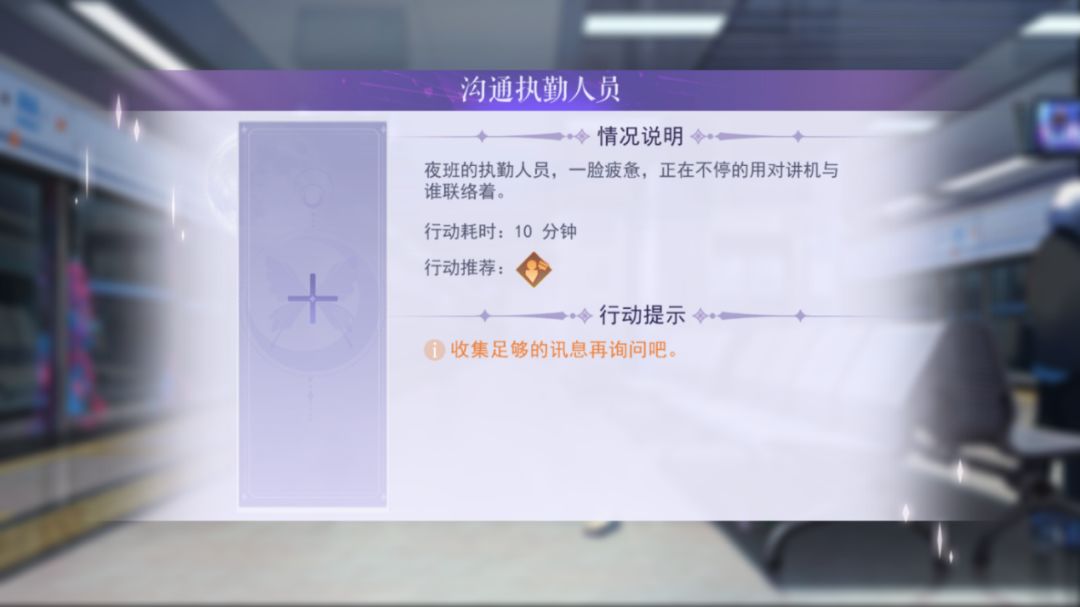 3、注意调查中的【行为提示】。比如在现代篇:1-1关卡中需要沟通地铁人员,调查中会提示“收集足够的信息再询问”,这时就需要社长大人先收集好其他线索再来沟通地铁人员。