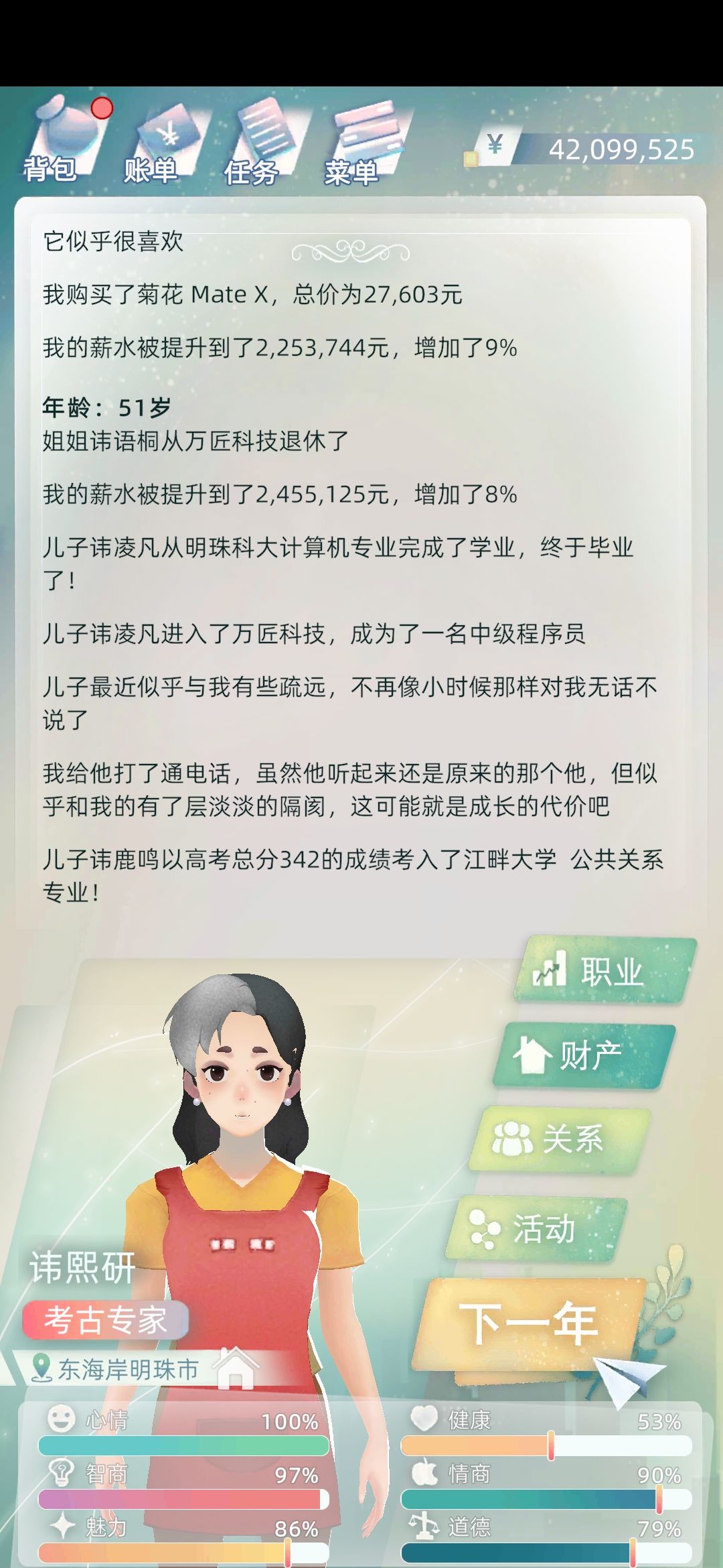 卡在考古专家的数值,智商90以上,情商上限为90,道德上限为80,理性能力和艺术能力都是100,数值面板橙色竖条位置为上限,可通过公司福利提高,每个职业提高的基础数值不一样。