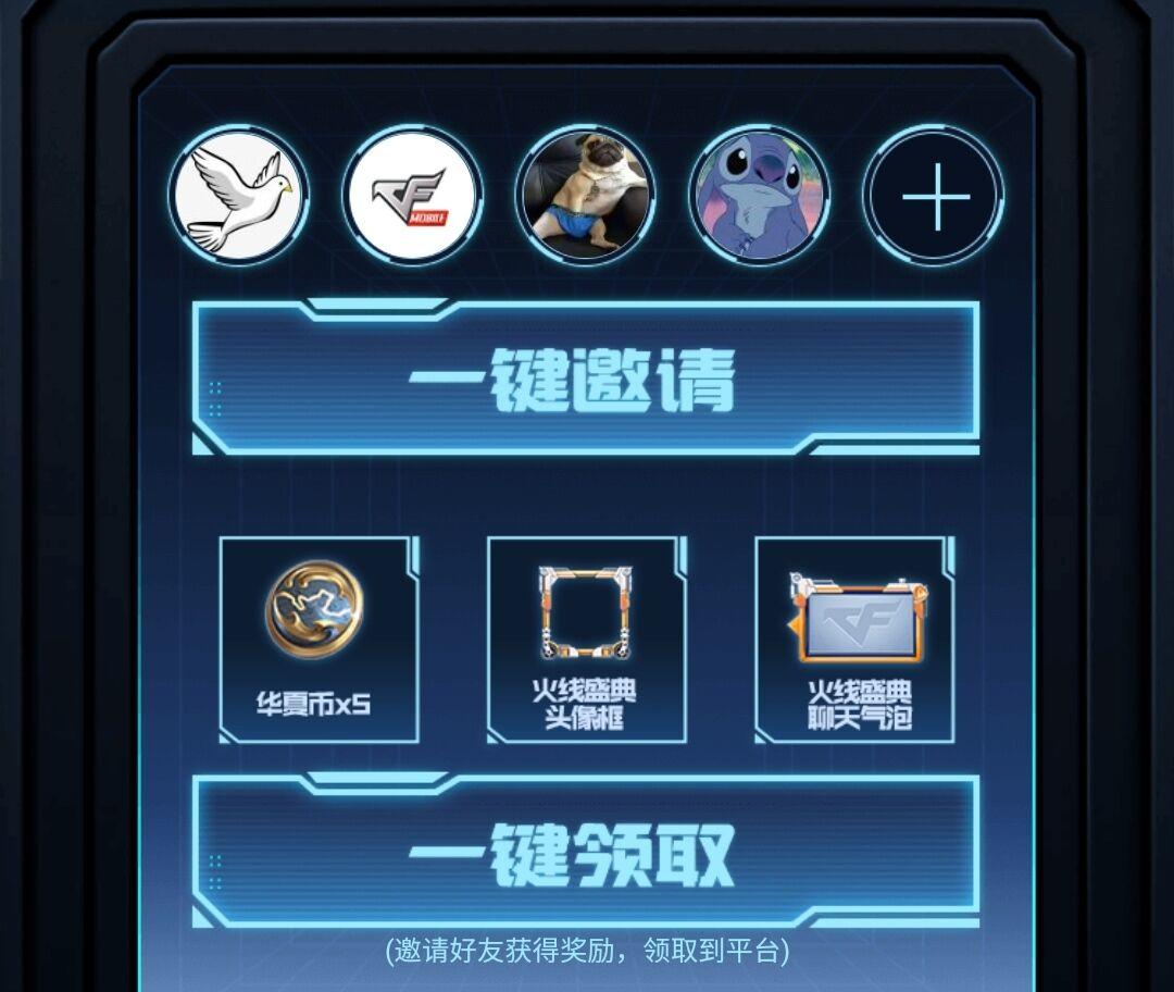 这个活动中唯一可以获得道具的地方只有最下方,只有参加这个邀请活动才可以获得奖励,其中获得的道具是限定的“火线盛典头像框、火线盛典聊天气泡”,另外还可以获得华夏币*5,虽然奖励不是非常贵重,但限定道具注定是意义非凡的。