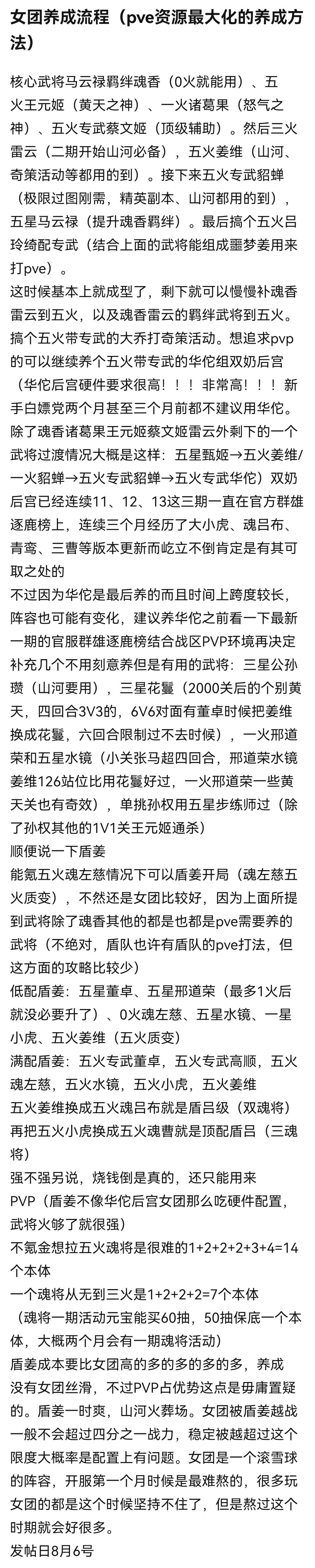 按照下面的图来先针对pve玩法来养女团会玩的很舒服(白嫖大概两个月就能养到图中基本成型的程度,pve没什么问题了,后续继续玩女团还是想养新阵容都可以)。成型之后不想玩女团了也可以根据最新的阵容强度榜去养最新阵容,或者根据xp养武将,这个游戏不像其他卡牌游戏只有前期资源多后面就越来越少养完一队就没资源了,这个游戏是能可持续白嫖的,除了一些限时皮肤外所有的资源都是能靠时间白嫖到的(唯一需要担心的就是时间久了会不会鬼区,这游戏不合区,最好去官服首战区玩,鬼区后一个军团三四个人基本上每天的分红和红包就相当于没有了)。这个游戏后期养武将很方便的,不像新手期元宝那么吃紧可以底价拍卖武将,每周竞技商店换的碎片日积月累起来也不是个小数目。