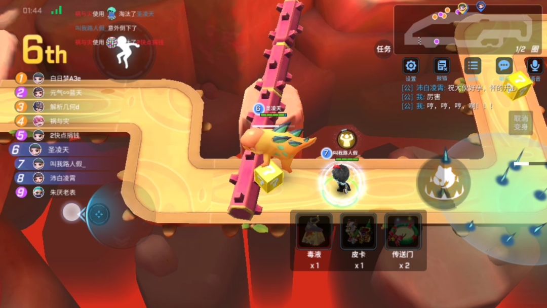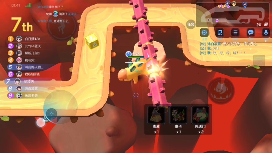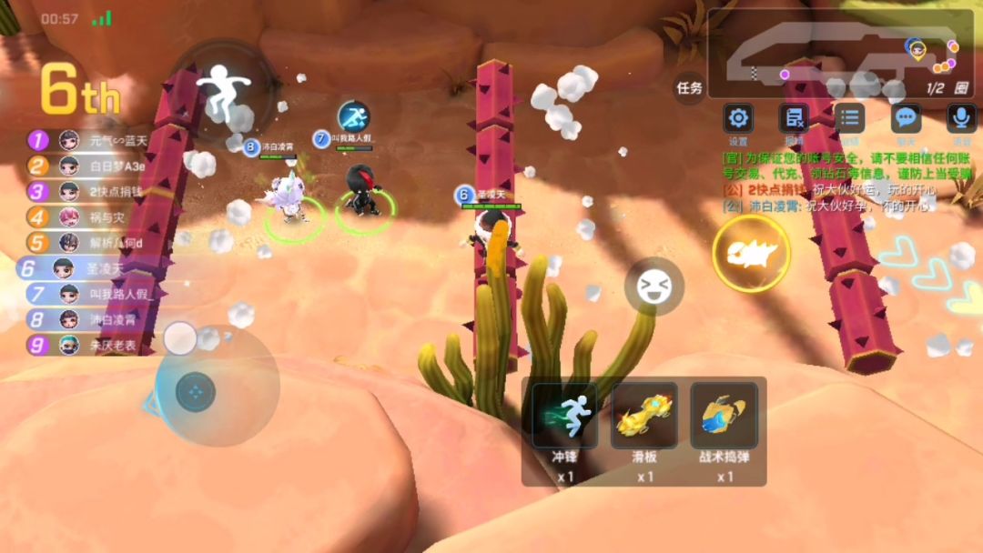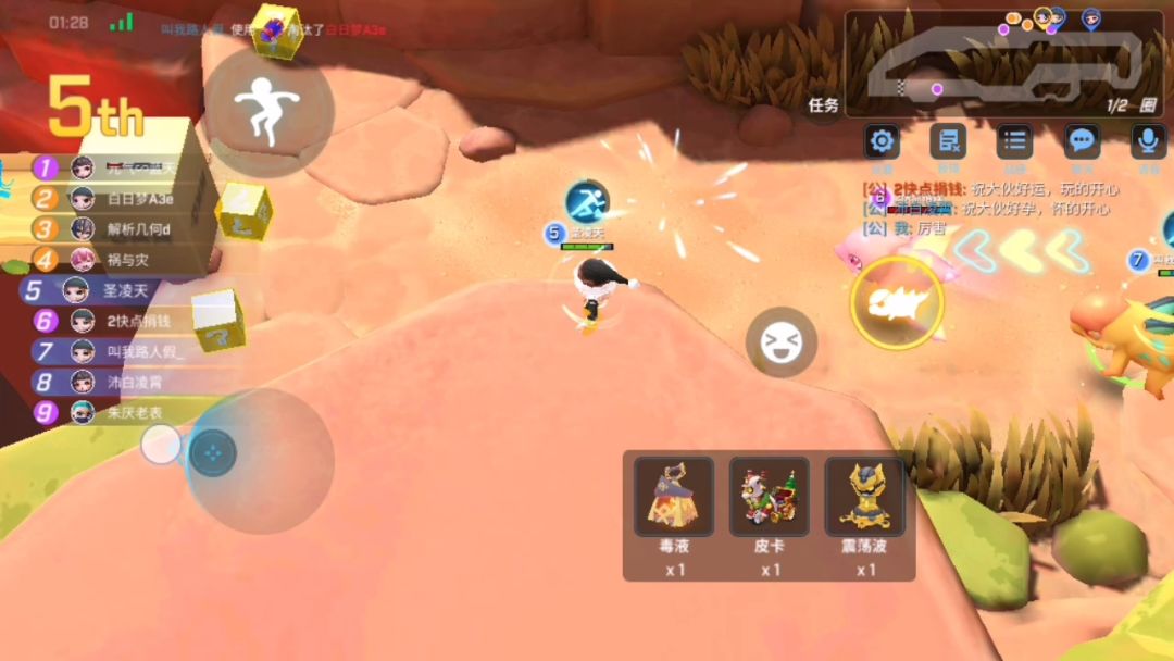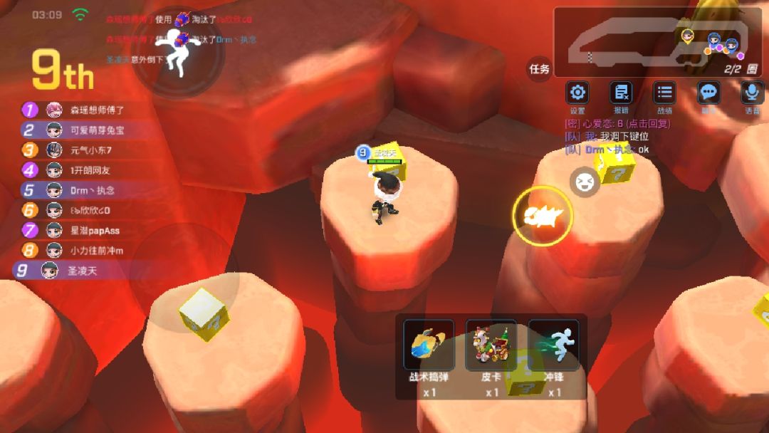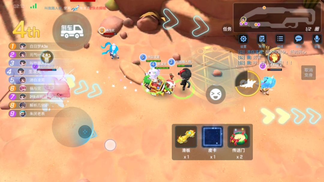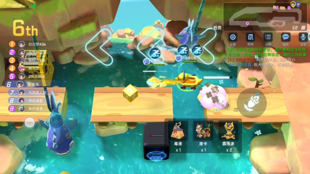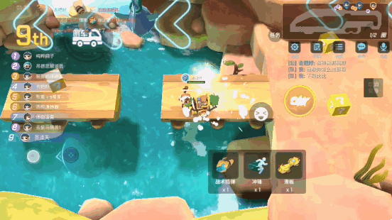 三队进行竞速,可以拾取道具卡加速自己或干扰敌方