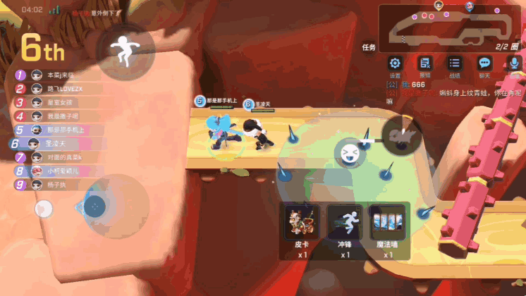 特点:障碍类道具卡(阻挡箱,气垫等)在这段都可以悬空放置,红色区域摔落即死,所以是最搞心态的一段,同时也是最适合反超的一段,也考验游戏理解