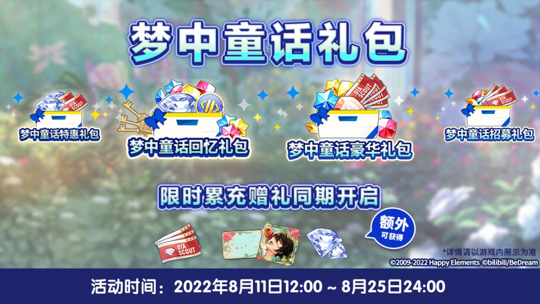 活动期间,商店追加多款超值礼包:【梦中童话招募礼包】【梦中童话豪华礼包】【梦中童话特惠礼包】【梦中童话回忆礼包】;礼包内容可在游戏内商店进行查看。