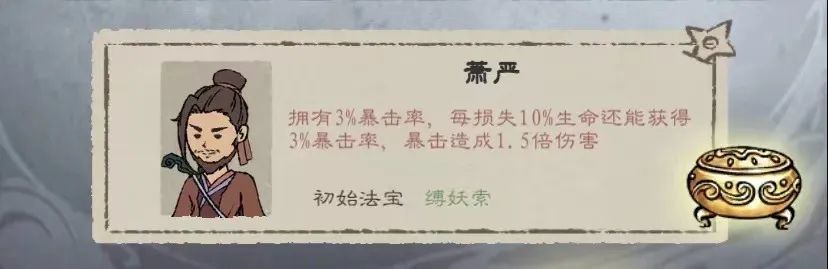 萧严,初始法宝--缚妖索,技能--拥有3%暴击率,每损失10%生命还能获得3%暴击率,暴击造成1.5倍伤害。