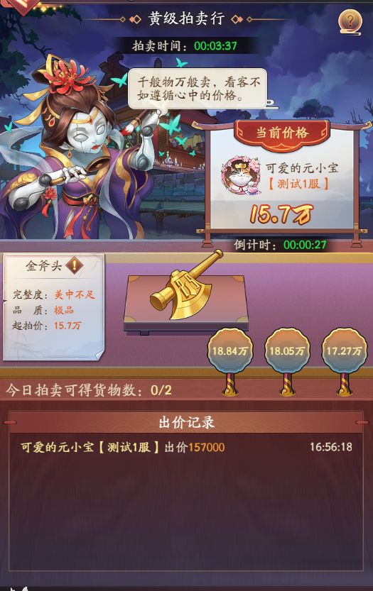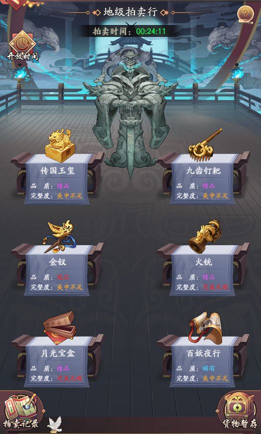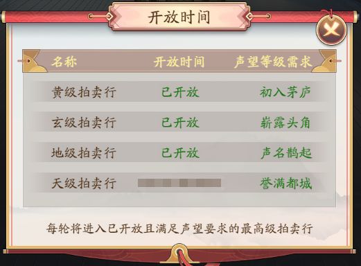 拍卖行分天、地、玄、黄4个等级,达到一定声望等级可进入对应等级的拍卖场。拍卖场等级越高,货物基础价格越高,盈利越多。拍卖场每小时进行1场竞拍,前30分钟为展示期可自由出价,后30分钟竞拍后30秒无人加价获得归属。
