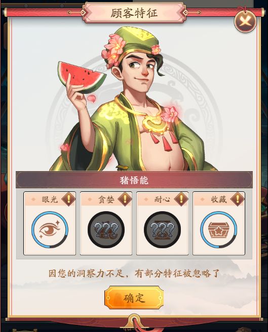 ◆运气:运气属性越高,决定随机事件的好坏以及出售赝品被发现的概率。
