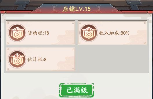 店铺属性:货物栏、伙计栏、收入加成。店铺初始1级,提升店铺等级可增加收入加成、货物栏、伙计栏的空间。店铺可使用钱币或图纸升级,满级15级共需100张图纸。
