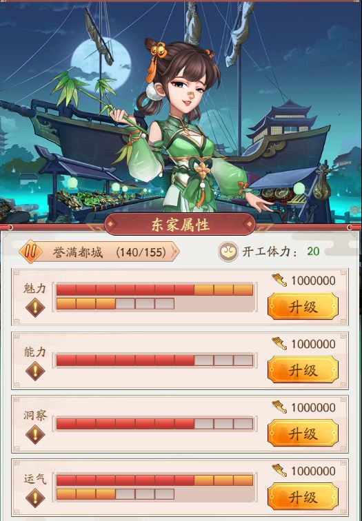 东家属性分为魅力、能力、洞察、运气,每升1级增加1点属性,满级10级,通过伙计最高额外增加10级。