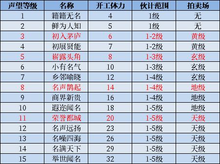 东家声望:每提升1级东家属性获得5点声望,达到一定声望可提升声望等级,满级15级。声望等级越高顾客出售的货物价格越高,开工消耗体力越高。