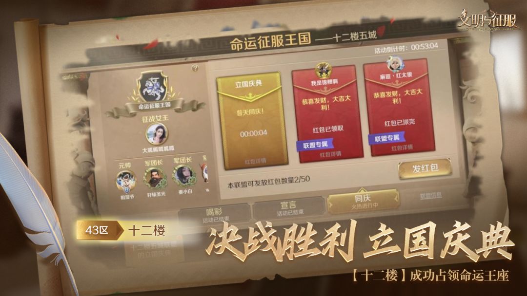 从一开始的素不相识到如今能够将自己后背交给对方,我们共同期待着在未来去挑战更强大的联盟,期待着在《文明与征服》的篇章中留下我们浓墨重彩的一笔,期待着许多年后能够与在游戏中认识的所有朋友一起举杯欢饮,然后将这段属于我们的传奇娓娓道来!
