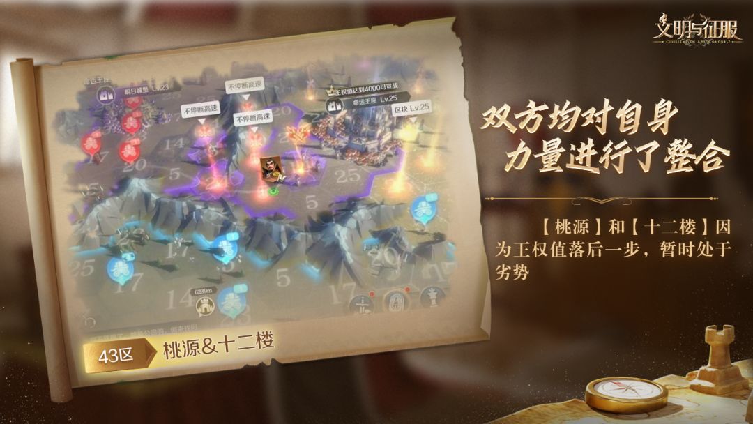整合完毕以后,【十二楼】火速西进至<须臾省>的<须臾神殿>,【桃源】也全力北上前往<往昔议会>。皇天不负有心人,【十二楼】、【桃源】抢先占领<须臾神殿>与<往昔议会>,边疆的防守得以保障,同时也使得战斗的中心从边疆转至<命运王座>周遭。
