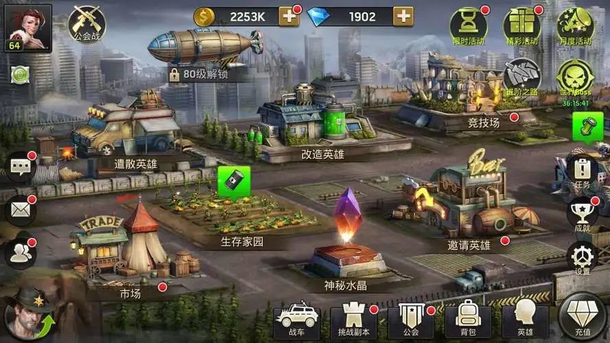 首先呢,此游戏内的功能玩法需要通过主城打开。主城内有许多建筑系统:市场(可以用金币和钻石购买一些基本材料和升级的宝石水晶等,还有一些英雄碎片和装备等等,可以定期免费刷新);