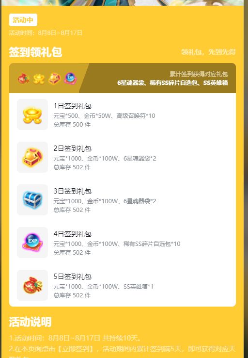 2.在本活动页面点击【签到活动】,活动期间内累计签到满5天,即可获得对应天数礼包。