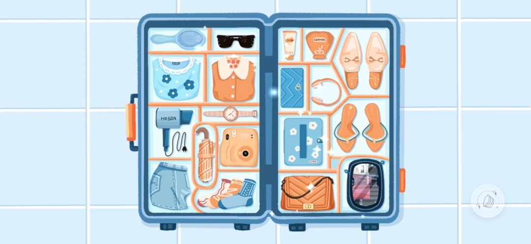 行李箱有些东西要丢掉(同理,有个整理男生鞋子那个也是要丢,比如高跟鞋等),有些东西要放进卡包(卡槽位置不可改,错了就放不进去)和化妆包里。
