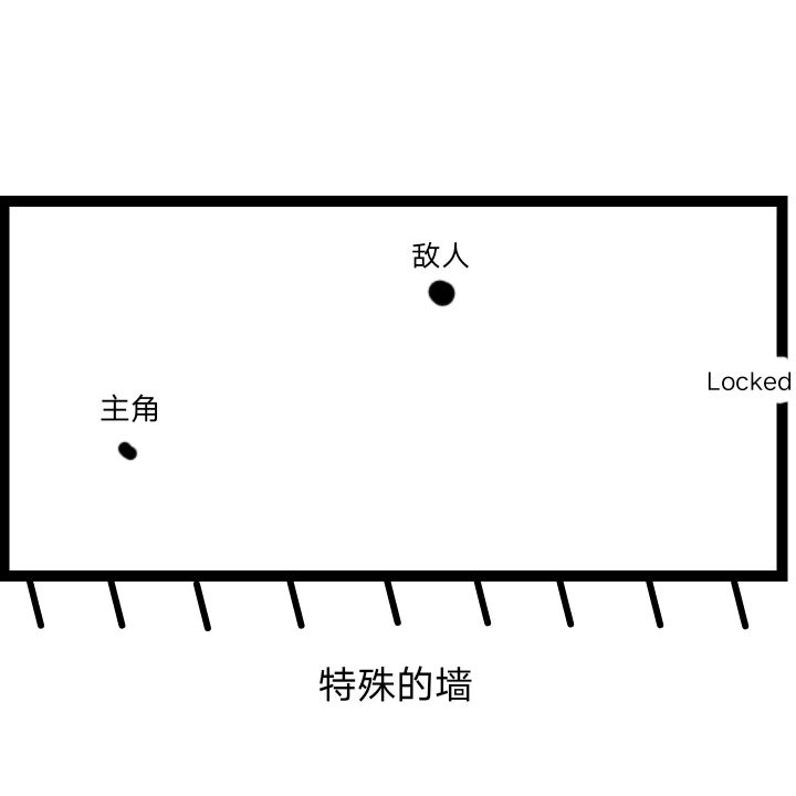 19.《无尽噩梦:诡监狱》主角斯科特·博伊德被锁在了一个房间,手上没有武器,附近有一个敌人,只有处决该敌人才能拿到钥匙前往另一个房间。幸运的是,主角所在的房间有一面特殊的墙,只要被触碰,武器就会出现,这样主角就可以处决该敌人。请你根据图中主角、敌人、房门的位置,制定一条主角的路线,并且总路程最短,用“→”表示,允许使用辅助线(不考虑敌人的移动)。(5分)