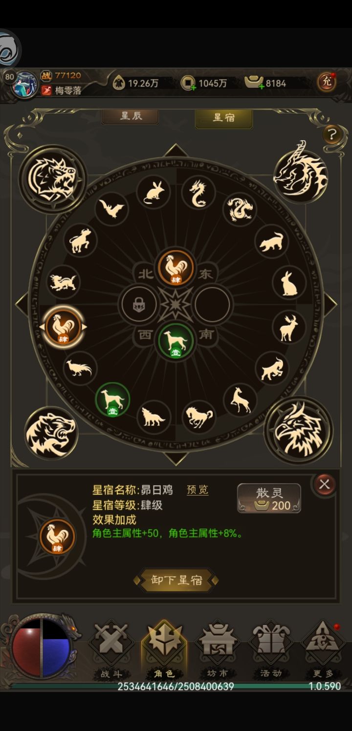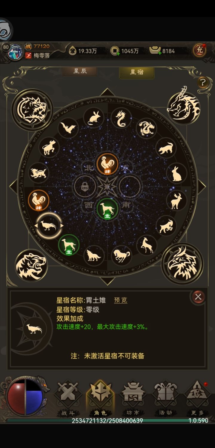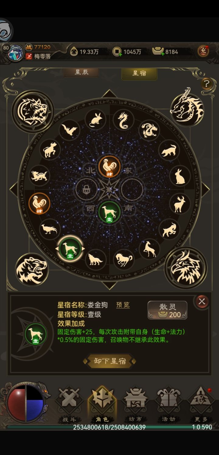 首先,详细讲解一下星辰系统,也就是生肖系统,由星辰每5级提供一个星辰点,使用星辰点可以随机出现12生肖和四大神兽,目前版本星辰升级难度巨大,不是巨氪,我估计玩个半年都不定能把四个基础生肖练满,理论上四个基础生肖全部升4级算是毕业,也就是16个生肖点,那么对应的生肖级别是64级,由于我玩的时间大约15天,目前才24级如图