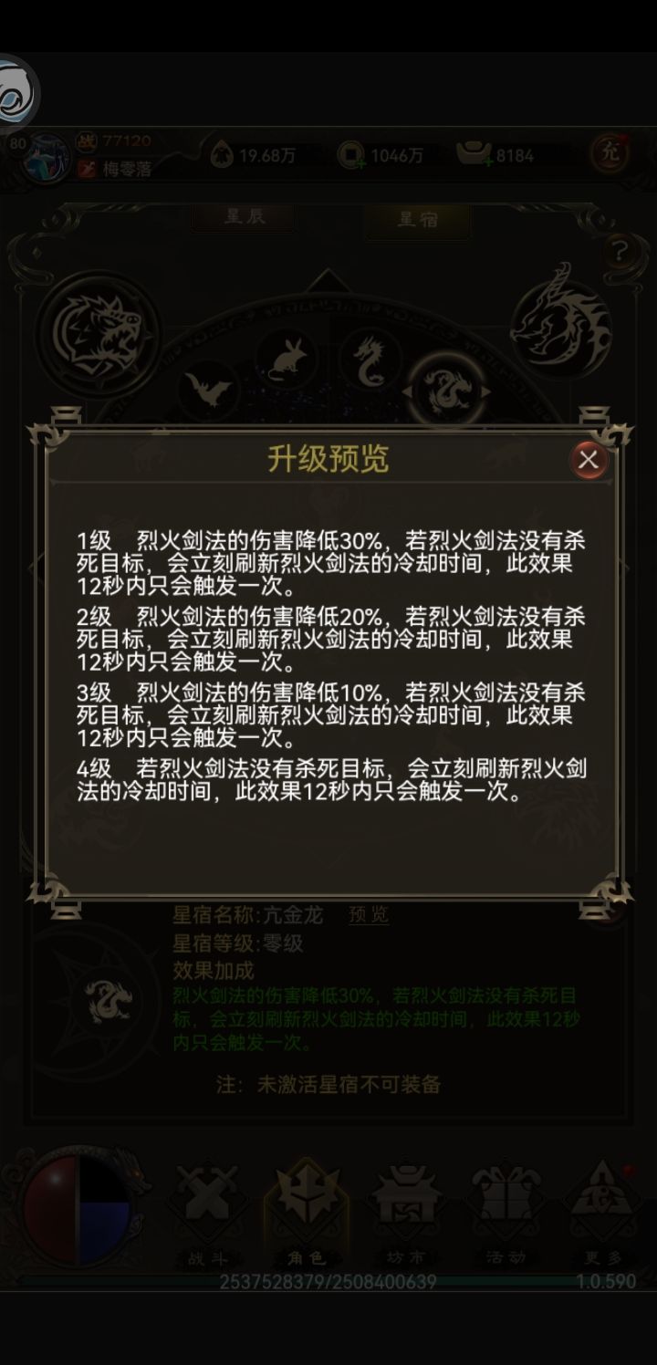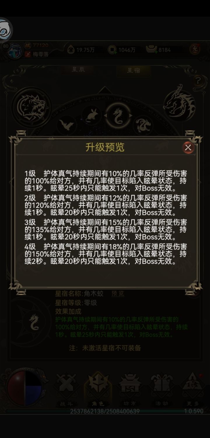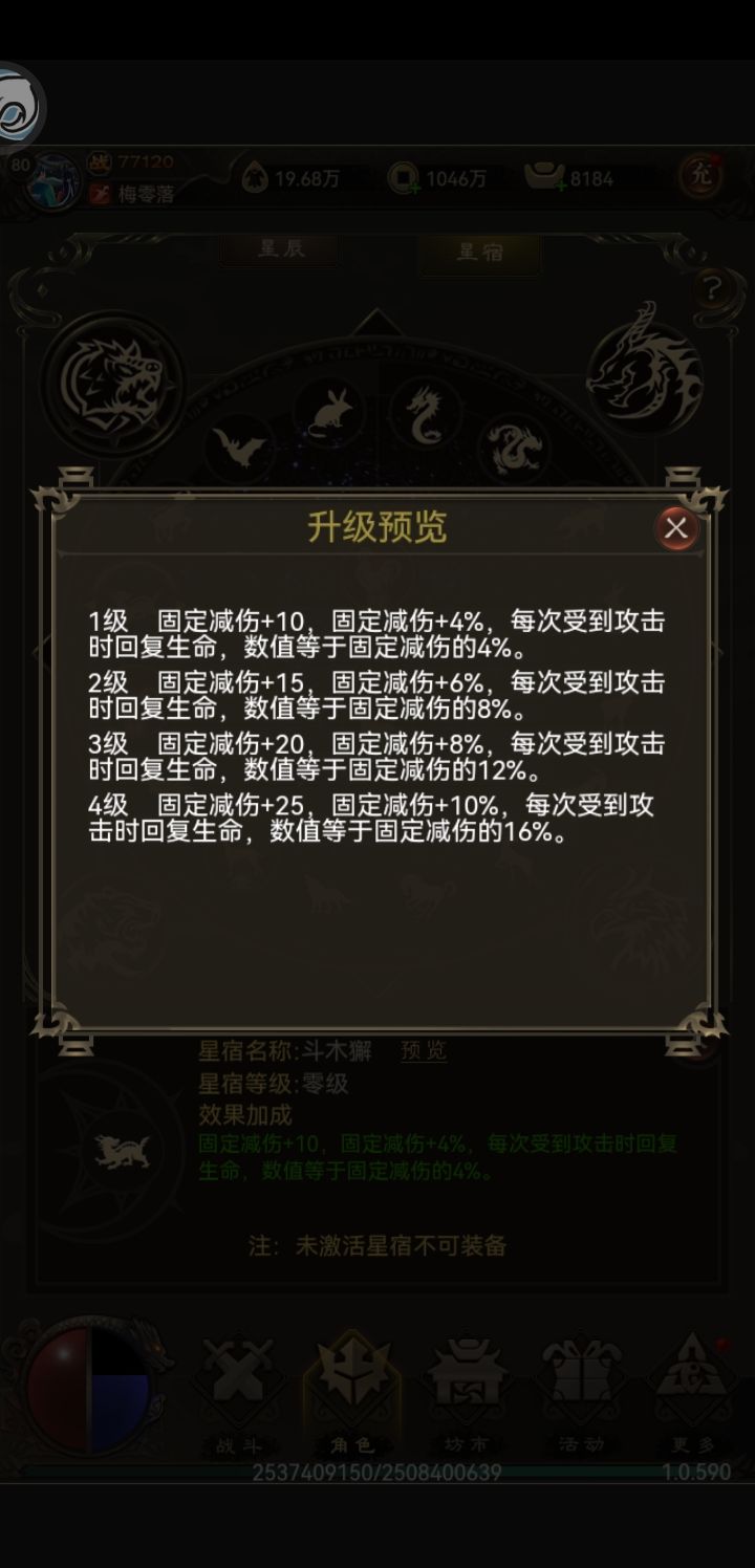 首先,详细讲解一下星辰系统,也就是生肖系统,由星辰每5级提供一个星辰点,使用星辰点可以随机出现12生肖和四大神兽,目前版本星辰升级难度巨大,不是巨氪,我估计玩个半年都不定能把四个基础生肖练满,理论上四个基础生肖全部升4级算是毕业,也就是16个生肖点,那么对应的生肖级别是64级,由于我玩的时间大约15天,目前才24级如图
