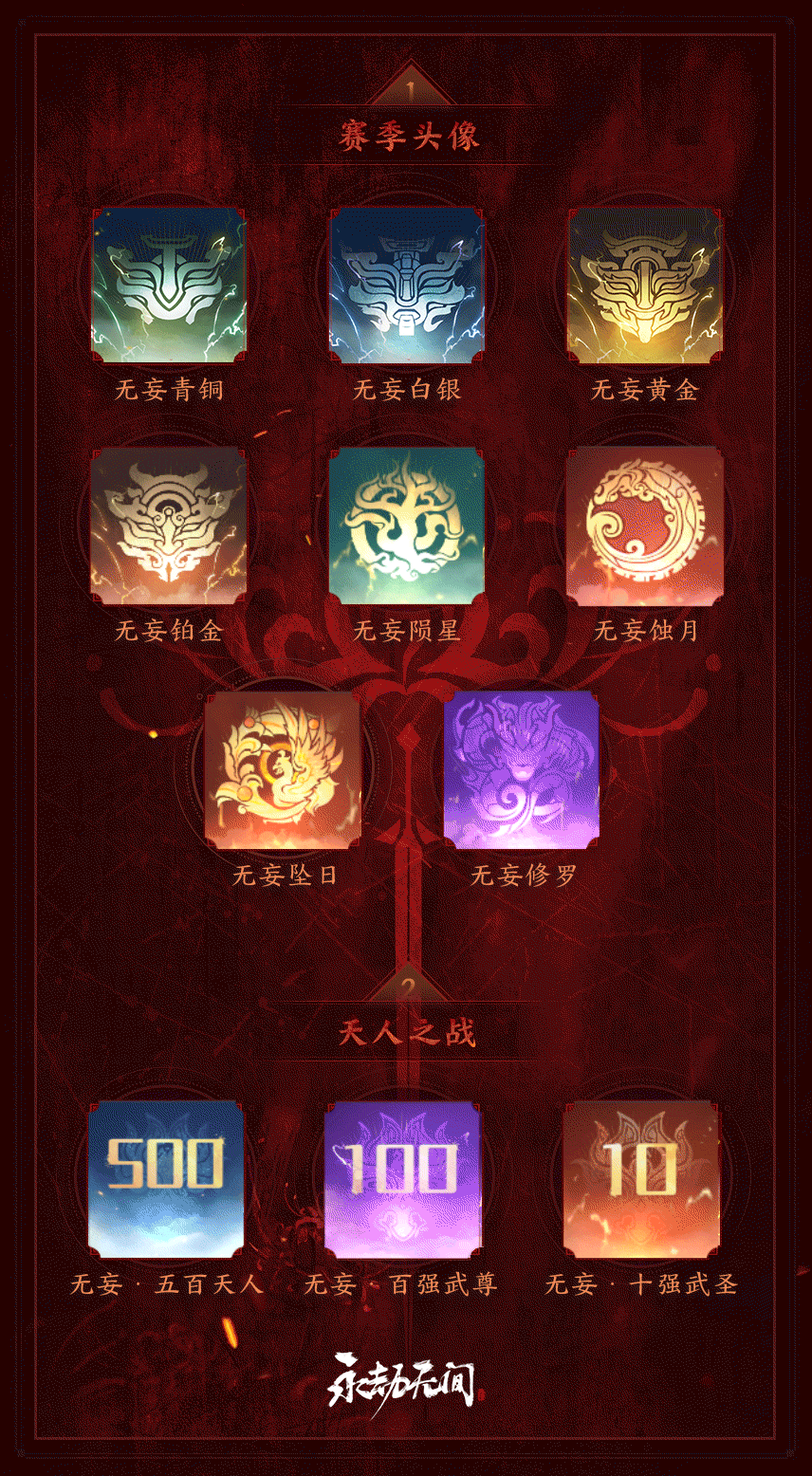 赛季结算时,根据玩家在无妄赛季获得的天人榜历史最高称号,发放本赛季的社交头像奖励。分别为:社交头像【无妄·五百天人】、【无妄·百强武尊】、【无妄·十强武圣】