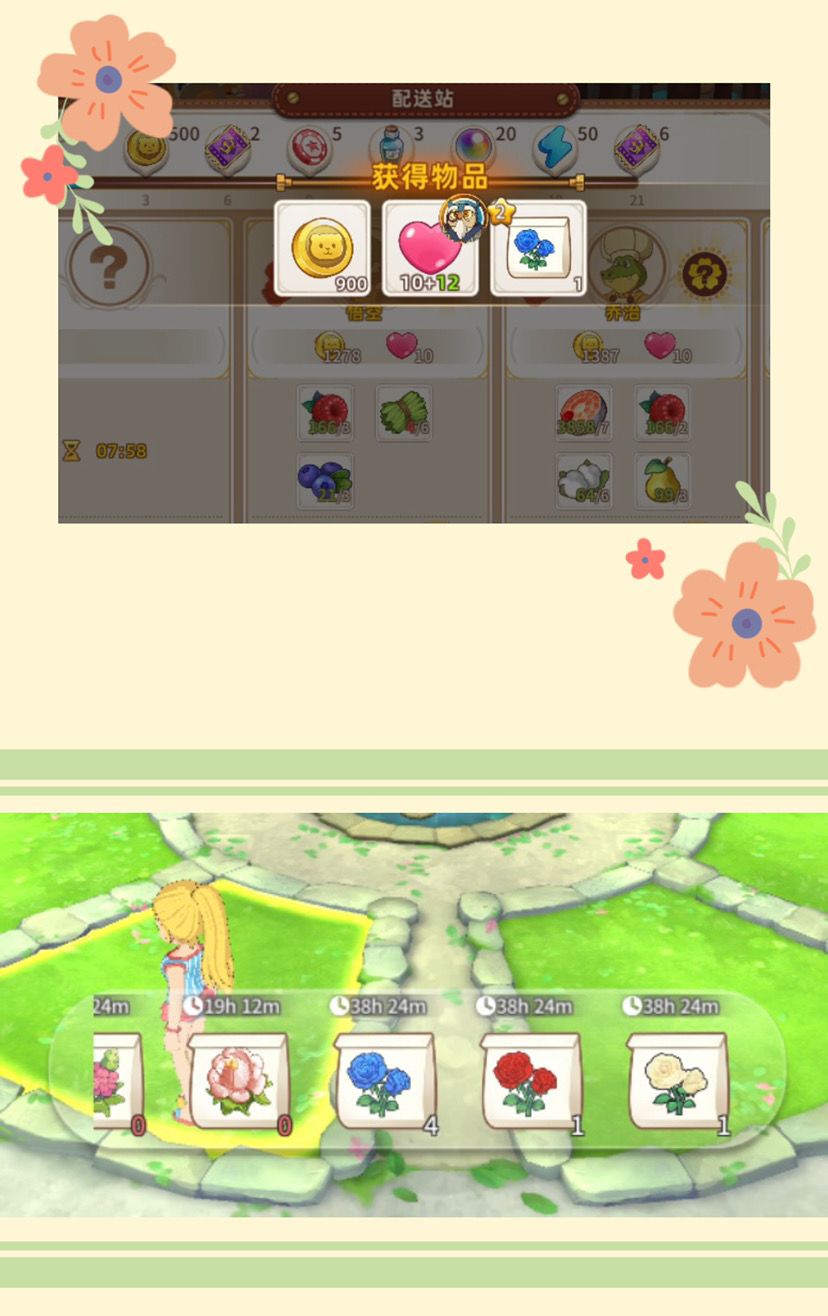 活动介绍:活动期间,完成单笔配送站订单,将随机获得3种玫瑰花苗的其中一种,将其种植在花园,成熟后可收获对应颜色的玫瑰花。活动前三天给npc赠送相应数量的白玫瑰花,更可获得5倍好感度与2张盲盒商店兑换券。