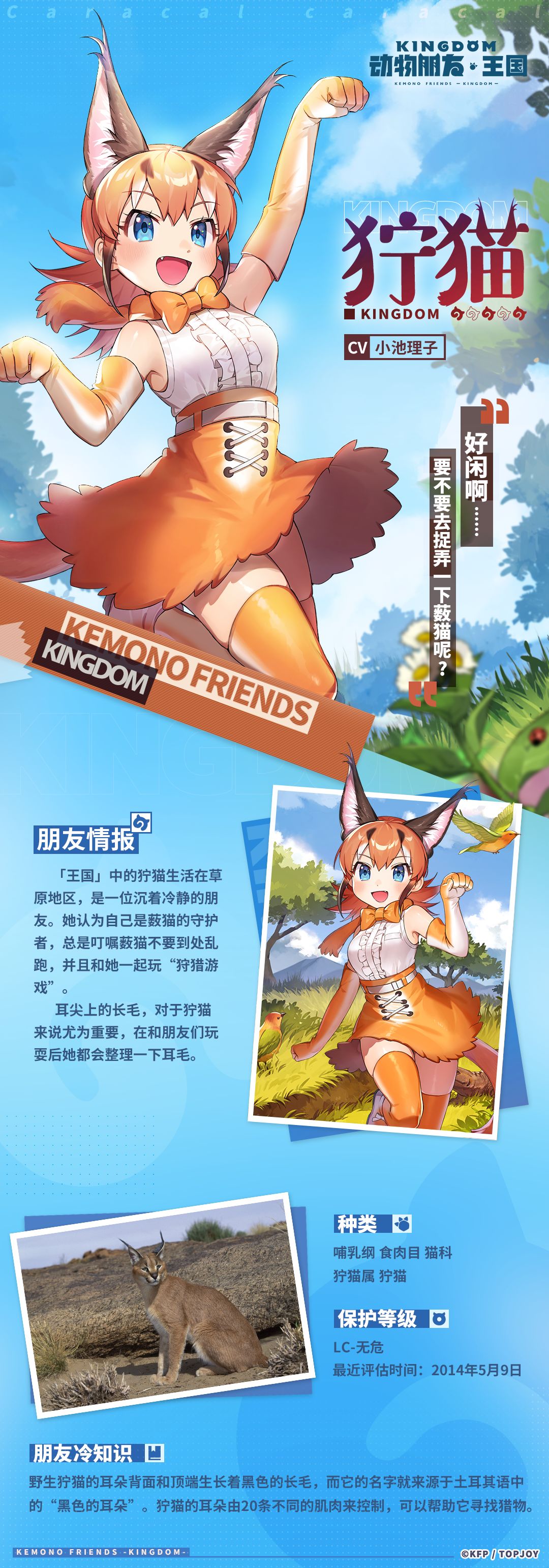 “我是狞猫喔。我耳尖上的毛看起来很棒吧?看着薮貓,真的一整天也不会腻呢。你说我是姐姐的感觉?是啊,我总会不小心照顾人呢。”