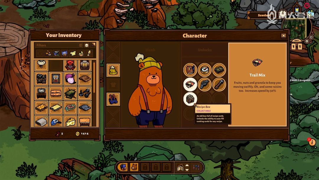 《熊与早餐》最突出的亮点之一是海量的合成物品。随着进度向前发展,新的家具、装饰品、食谱会在每个分店旁边的工作台上面解锁。玩过《模拟人生 4》或《集合啦!动物森友会》的玩家会很熟悉这套系统。(我很高兴看到游戏里能一次制作多个物品!)