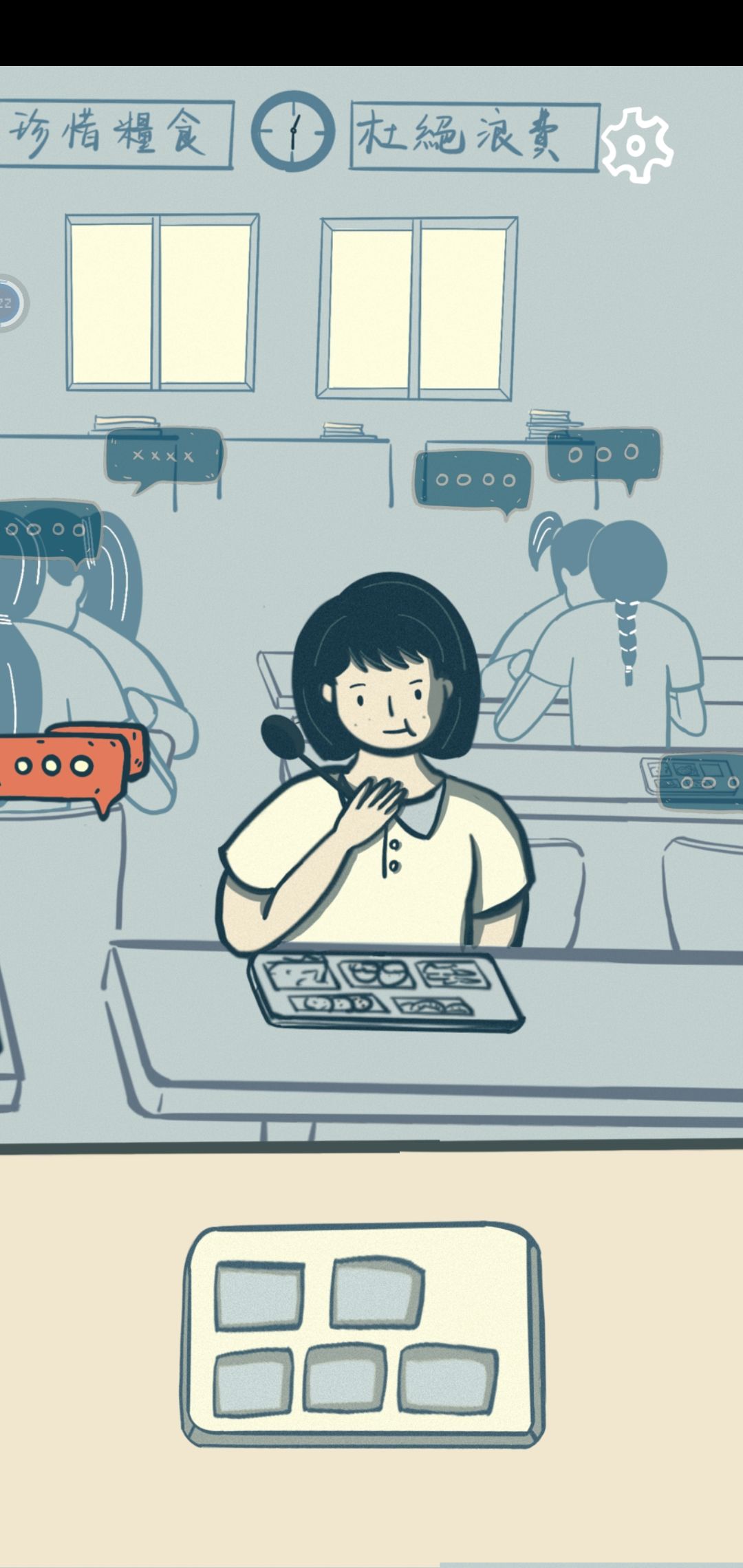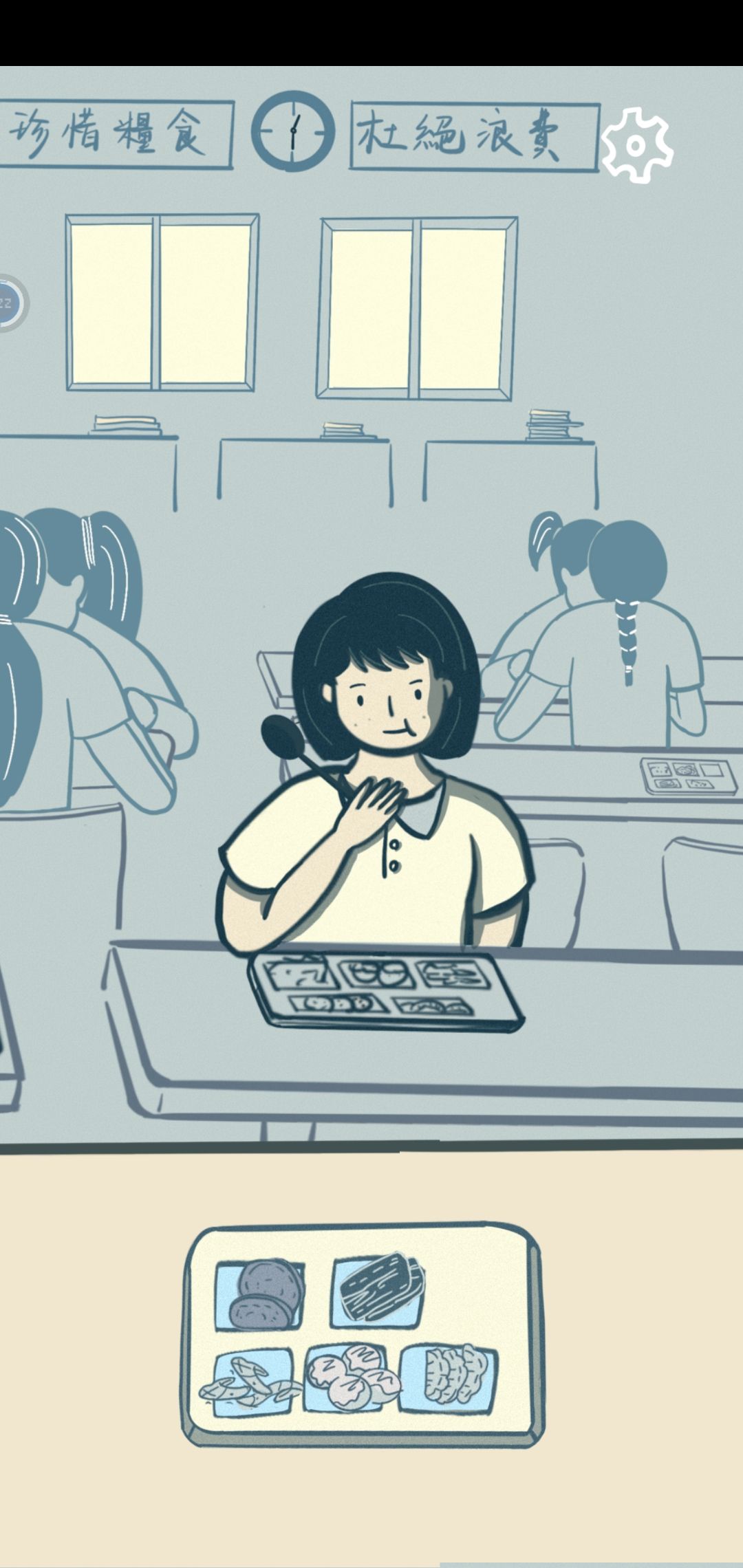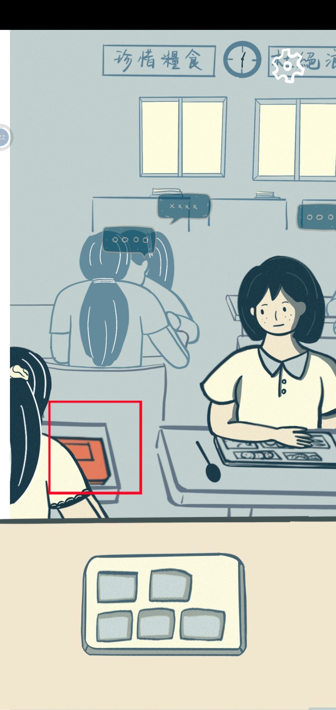 点击左边女生桌子前的红色饭盘。