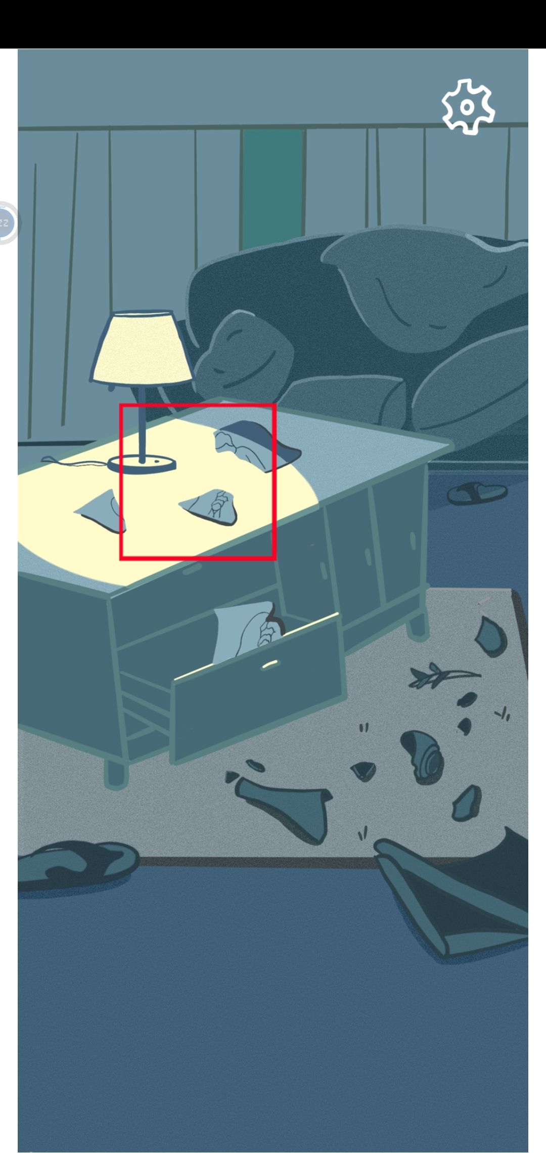 出现一扇门,点击门两次,门打开后出现客厅,点击茶几。