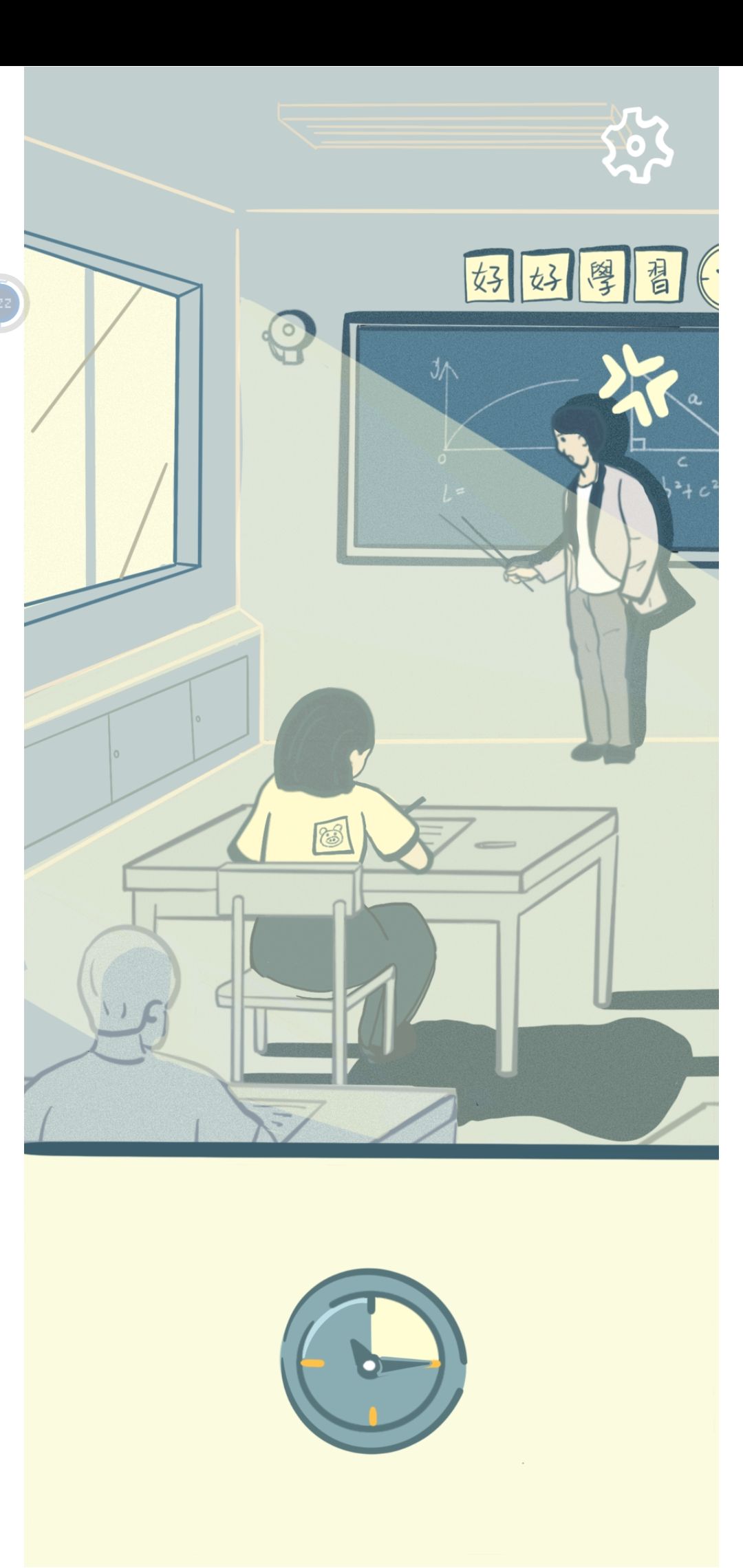 每当老师的头上出现“╬”的符号时,就点击一次下方的时钟,让女生回过头来。多次以后下课铃响起。
