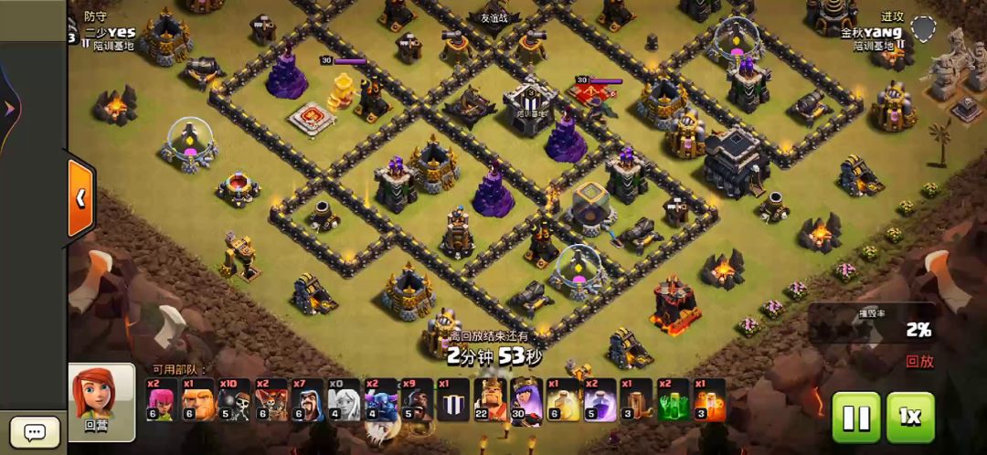 配兵分析:此配兵分为三主力,第一天女,第二皮法,第三野猪。野猪的加入大大互补了皮法处理外围防御的吃力,但要皮法打出一定的暴发。