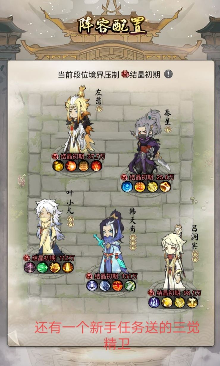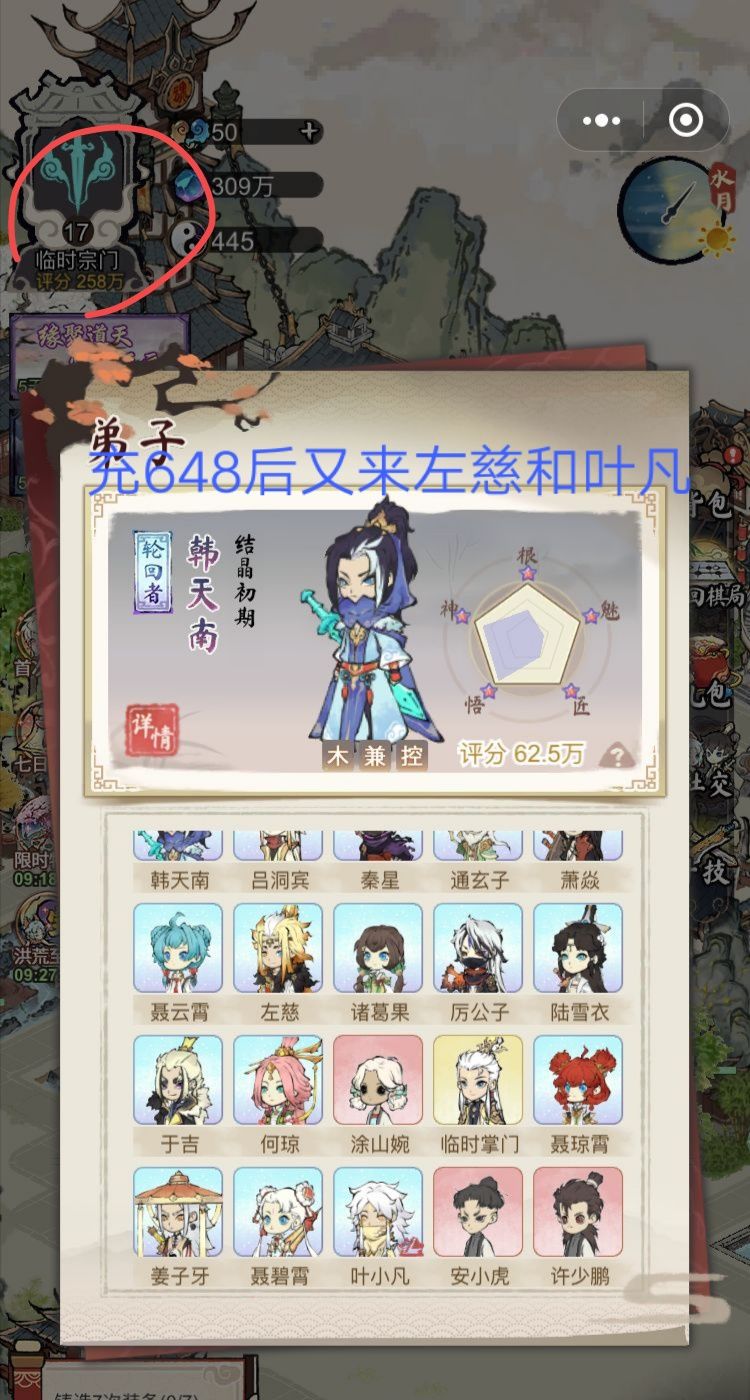 然后开局就抽到三个韩天南,两个秦星,一个通选子,当时不了解,进群后发图问阵容搭配,然后就被骂了🌚后来才发现,欧皇竟是我自己🌚,然后我就氪了几个技能,接着就出了叶凡,三个左慈,……从此直接上头了,连肝了五天,第三天韩天南三觉,第五天炼妖塔第一通关……