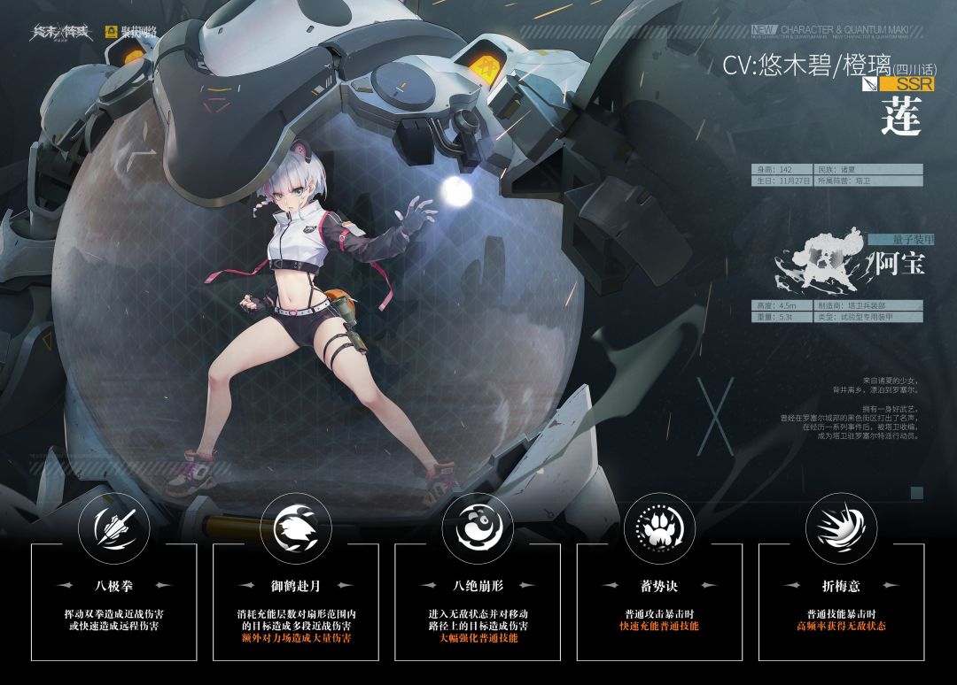 【林隐浪客】莲乐观热情,做任何事都会全力以赴,但也有不计后果就行动,容易冲动,粗枝大叶的性格特点,经常惹出一些小麻烦,没少挨批评。但尽管如此,她依旧是非常可靠的塔卫成员,就算面临多么凶险的局面,往往也能被她逢凶化吉,除了幸运的眷顾,相信她还有其他闪光的特质。“我的动作很奇怪?真不识货,这可是久负盛名的赵门炮拳,它是诸夏的「百拳之母」,许多拳法都源自于它,其中就包括我擅长的八极拳。”——莲