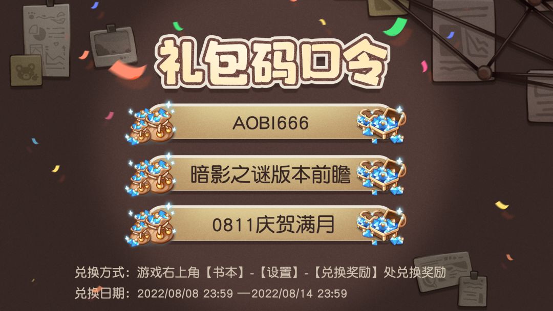 ⭐兑换码:【AOBI666】、【暗影之谜版本前瞻】、【0811庆贺满月】⭐兑换方式:击游戏右上角【书本】-【设置】-【兑换奖励】即可领取⭐有效期:2022/08/14 23:59前有效